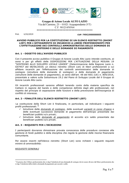 06-06-2019 GAL Alto Lazio - Avviso pubblico per la costituzione di un elenco ristretto (short list) per l'affidamento di incarichi a liberi professionisti per l'effettuazione dei controlli amministrativi delle domande di sostegno e delle domande di pagamento