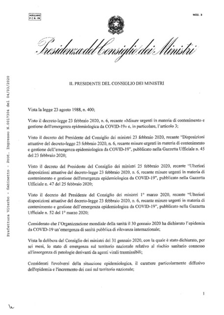 05-03-2020 Emergenza sanitaria COVID-19 - Decreto del Presidente del Consiglio dei Ministri del 04 marzo 2020
