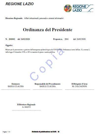 28-02-2020 Ordinanza del Presidente della Regione Lazio 26 febbraio 2020, n. Z00002 - Misure per la prevenzione e gestione dell'emergenza epidemiologica da COVID-2019