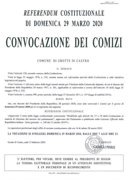 13-02-2020 Referendum Costituzionale del 29 marzo 2020 - Convocazione dei comizi elettorali